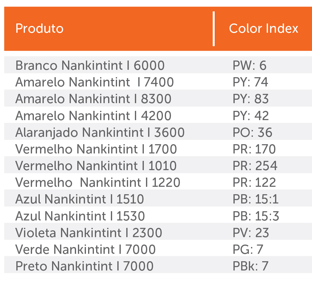 Os colorantes da linha Nankimtint I foram especialmente formulados em resina sintética compatível com diversos sistemas poliméricos, desta forma o Nankimtint I apresenta-se como um colorante versátil podendo o ser único concentrado de pigmento para todas as tintas base solvente indústrias.